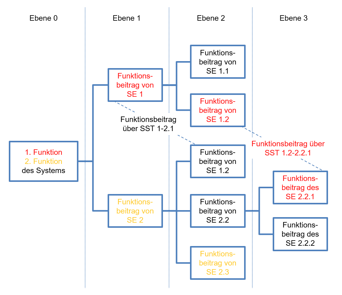 In der Ebene 1 (Spalte) zeigen sich zwei Baugruppen (SE 1, SE 2), die gemeinsam alle Funktionen des Systems auf Ebene 0 erfüllen. In der Ebene 2 finden sich sowohl eine Unterbaugruppe (SE 2.2) als auch mehrere Bauteile (SE 1.1, SE 1.2, SE 2.1, SE 2.3), die im Zusammenwirken wiederum alle Funktionen des Gesamtsystems erfüllen. In der Ebene 3 sind zwei Bauteile (SE 2.2.1, SE 2.2.2) eingeordnet, die Funktionsbeiträge für die Unterbaugruppe SE 2.2 liefern.