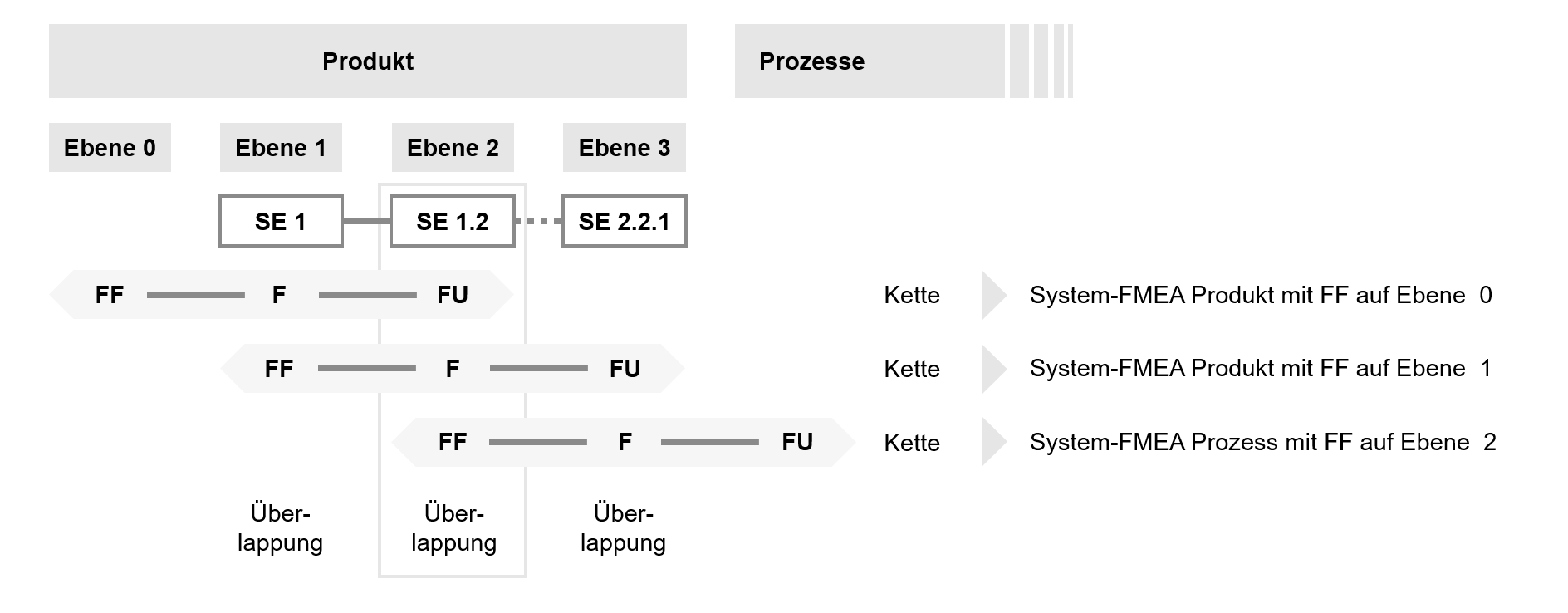 Fehlfunktionen von Einzelteilen resultieren häufig aus unzulässigen Beiträgen der Herstellprozesse. Aus diesem Grund müssen für die Analysen auch Überlappungen zwischen der System-FMEA Produkt und der System-FMEA Prozess gebildet werden (siehe auch Abbildung 1).