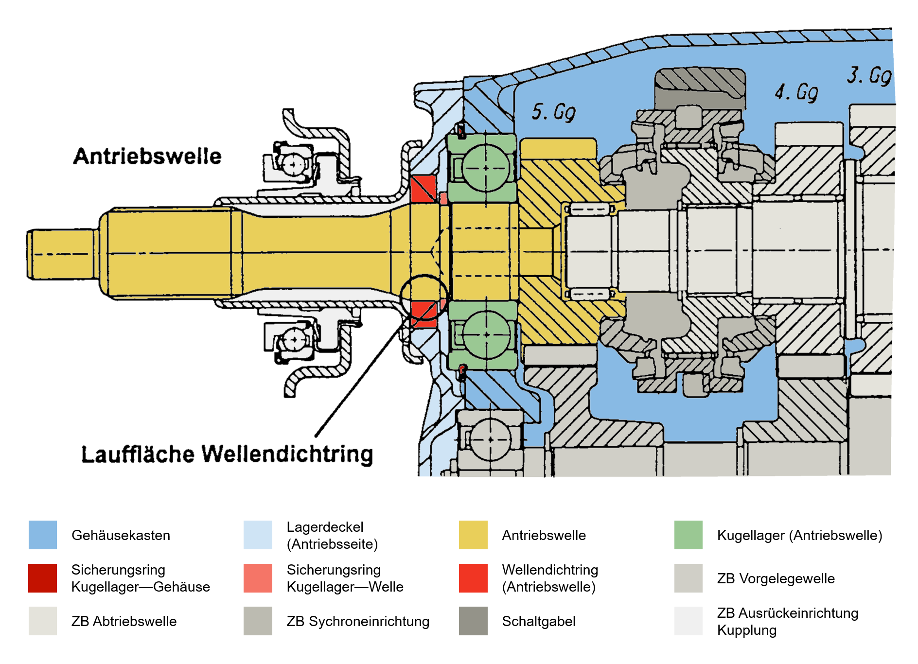 Folgende Abbildung zeigt einen Ausschnitt aus dem Zusammenbau des Schaltgetriebes. Der Schwerpunkt der Betrachtung wird im Verlauf der Analyse auf der Lauffläche des Wellendichtrings liegen. Die grau hinterlegten Baugruppen werden in der Analyse nur am Rande betrachtet.