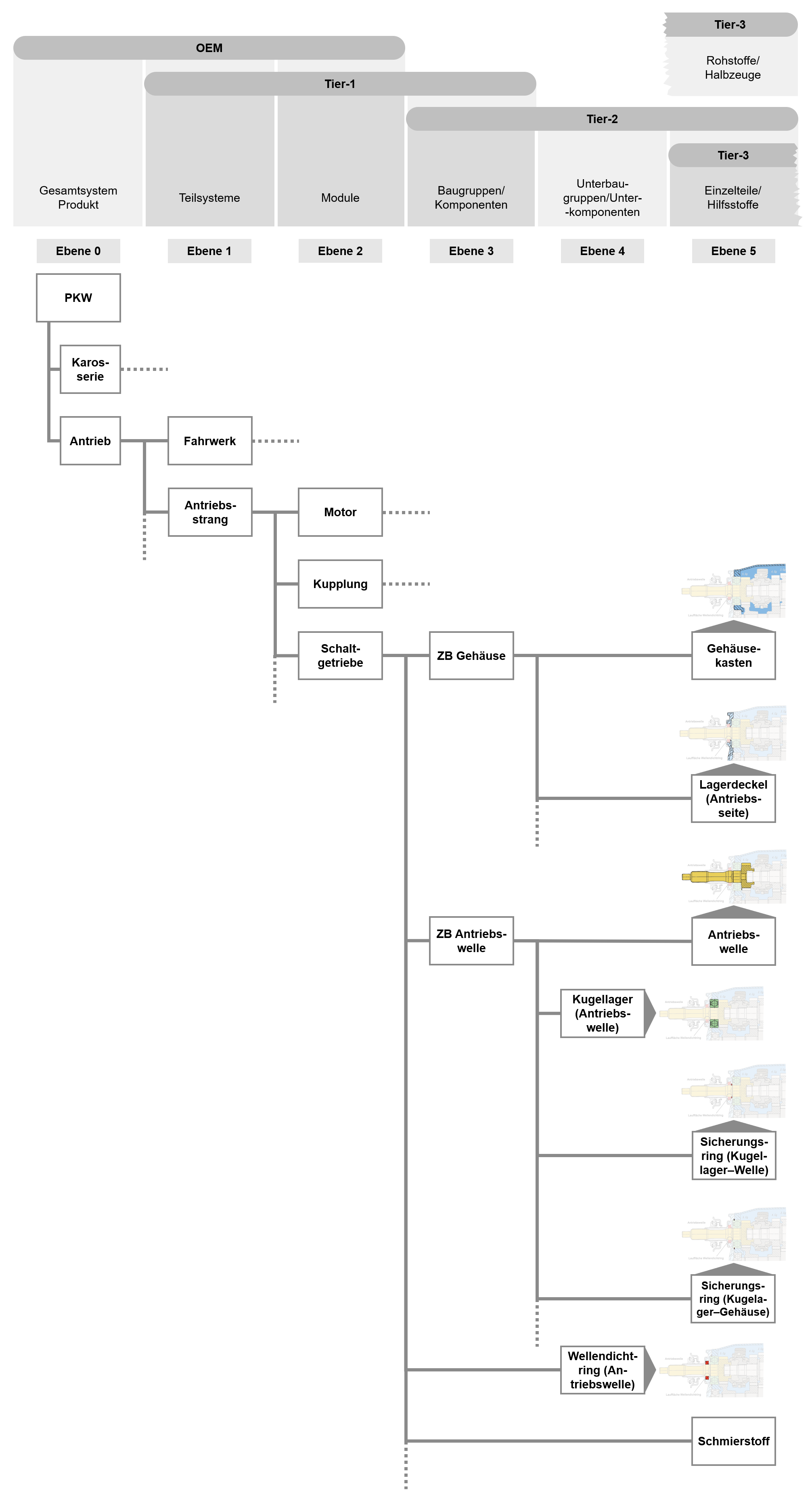 Für das gewählte Beispiel sind zunächst Überlappungen zwischen dem Gesamtsystem, Teilsystemen, Modulen, Baugruppen/Komponenten, Unterbaugruppen/​Unterkomponenten und Einzelteilen/​Hilfsstoffen innerhalb des Produkts PKW zu beachten. Die für die Analyse relevanten Systemelemente sind in folgendem Auszug aus der PKW-Systemstruktur dargestellt.