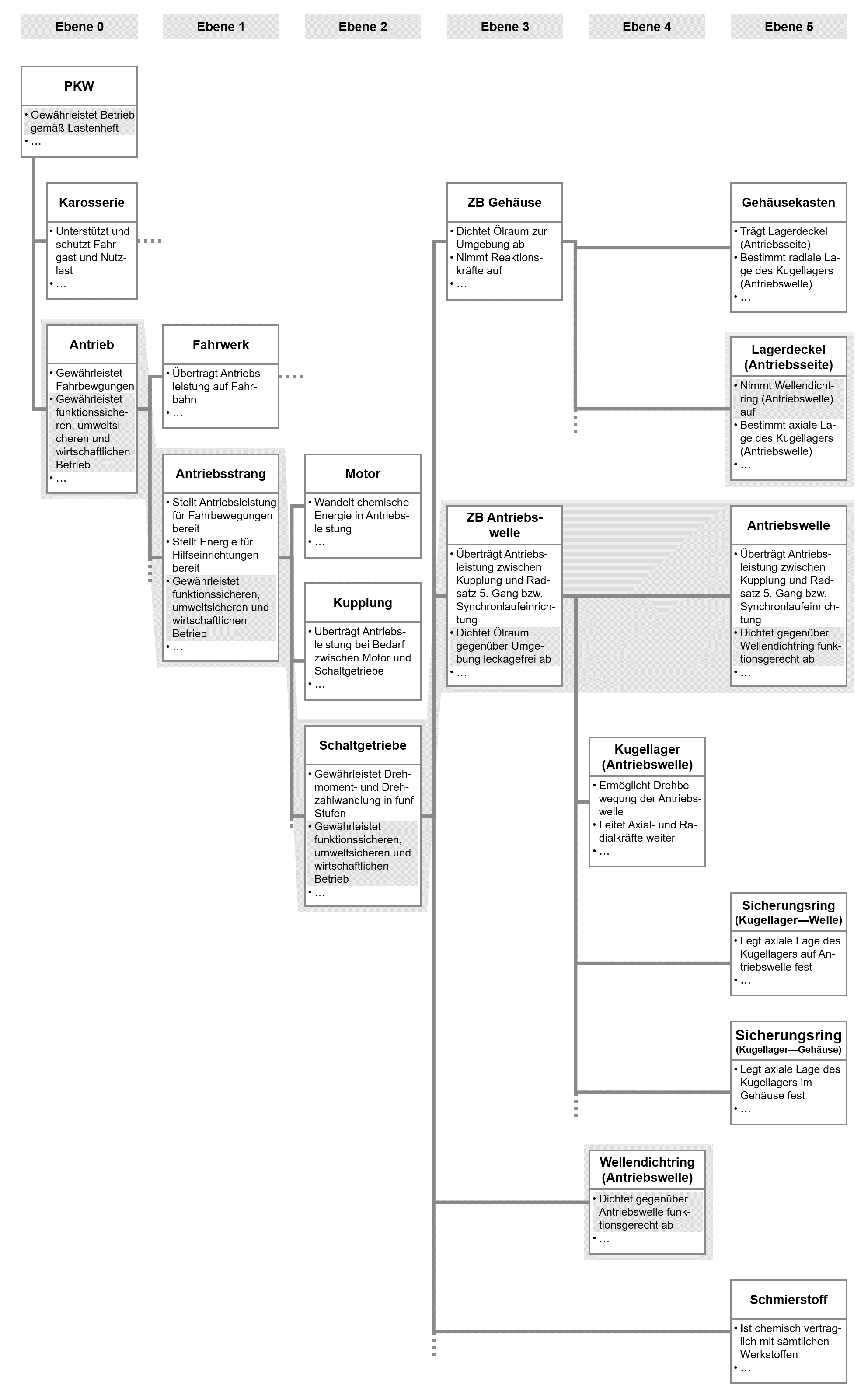 Beispielhaft ist das Zustandekommen der PKW-Teilfunktion Gewährleistet störungsfreien/wirtschaftlichen Betrieb gemäß Lastenheft in folgender Abbildung dargestellt. Die für das Analysebeispiel relevanten Systemelemente und Teilfunktionen sind grau hinterlegt. Damit das Systemelement Schaltgetriebe die Funktion Gewährleistet umweltgerechten und funktionssicheren Betrieb erfüllen kann, müssen beispielsweise die untergeordneten Systemelemente ZB Antriebswelle, Lagerdeckel und Wellendichtring Funktionsbeiträge liefern.