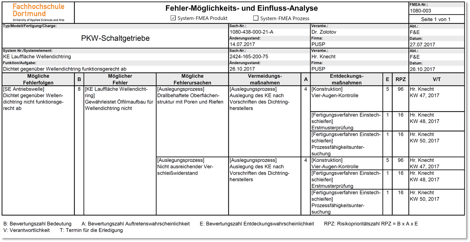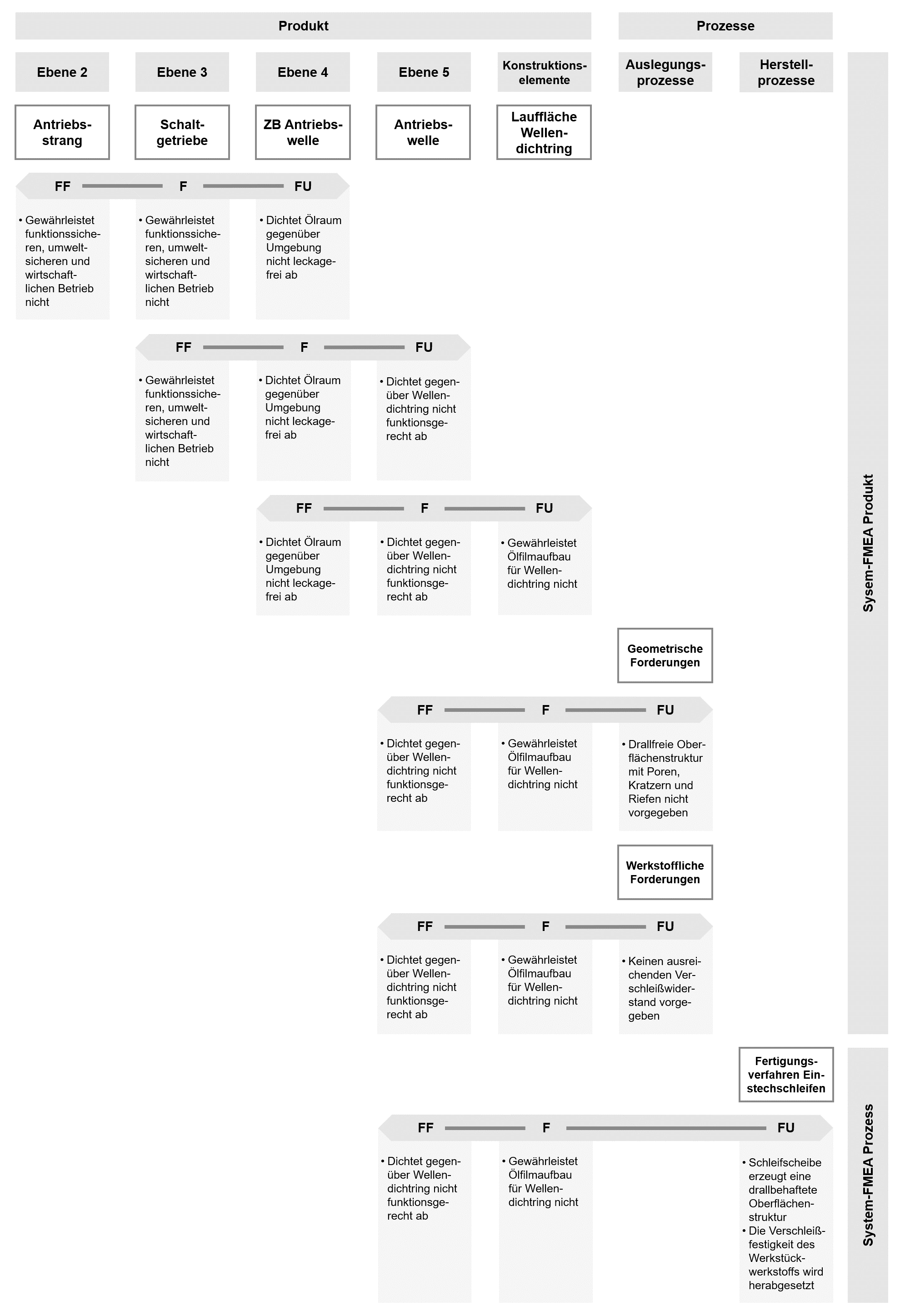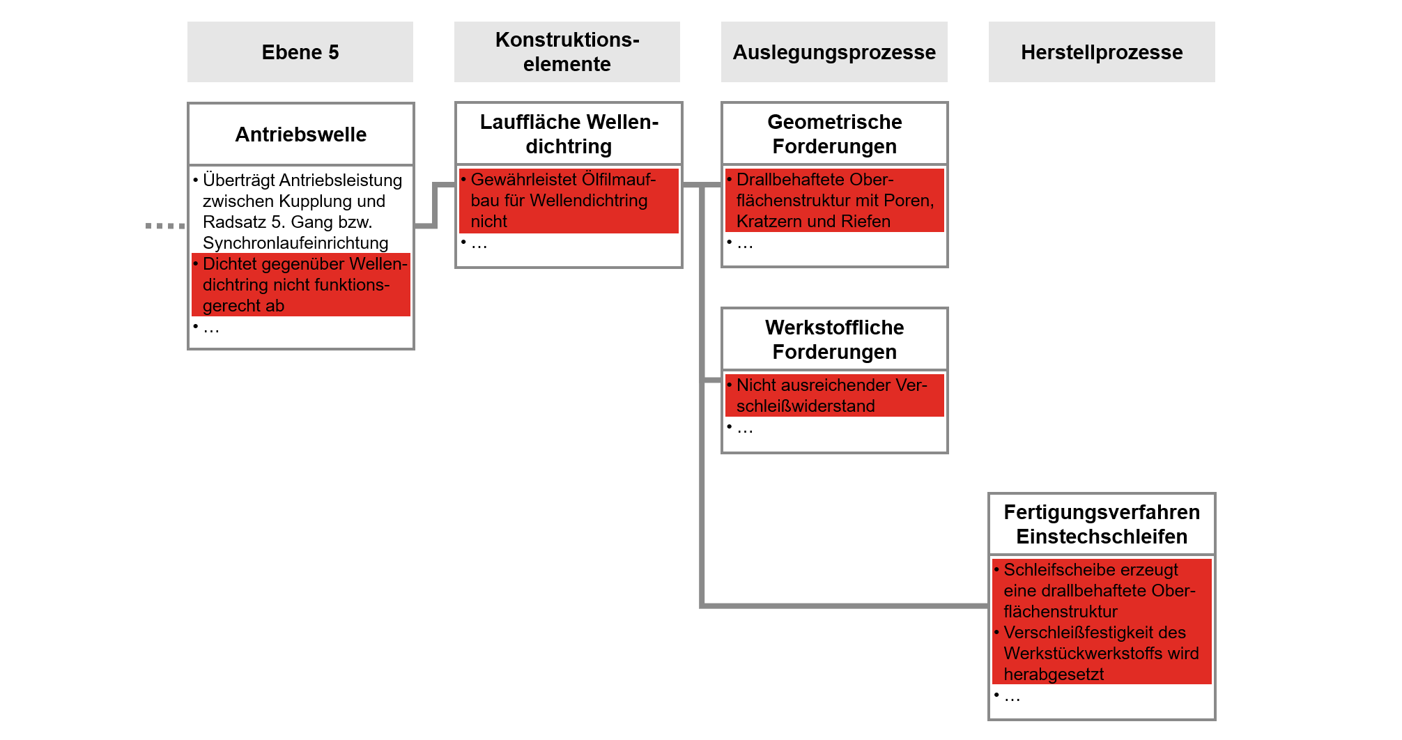 Folgt man den Überlappungen, stellt man fest, dass das Einzelteil Antriebswelle im Bereich des Konstruktionselements Lauffläche Wellendichtring Merkmale aufweist, welche nicht funktionsgerecht sind: Drallbehaftete Oberflächenstruktur mit Poren und Riefen sowie Nicht ausreichender Verschleißwiderstand. Eine mögliche Fehlerquelle ist auf Ebene der Konstruktionselemente bei der Lauffläche Wellendichtring auf der Antriebswelle zu finden: Gewährleistet Ölfilmaufbau für Wellendichtring nicht. Diese Fehlfunktion kann zum einen durch eine nicht funktionsgerechte Vorgabe durch den Konstrukteur im Auslegungsprozess oder durch eine nicht forderungskonforme Umsetzung dieser Vorgaben durch den Prozesseinrichter im Herstellprozess hervorgerufen werden. Auslegungsfehler werden vor Serienanlauf spätestens im Rahmen vorläufiger Prozessfähigkeitsuntersuchungen oder der Erstmusterprüfung entdeckt. Mögliche Fertigungsfehler nach Serienfreigabe werden durch Langzeitprozessfähgigkeitsuntersuchungen minimiert.